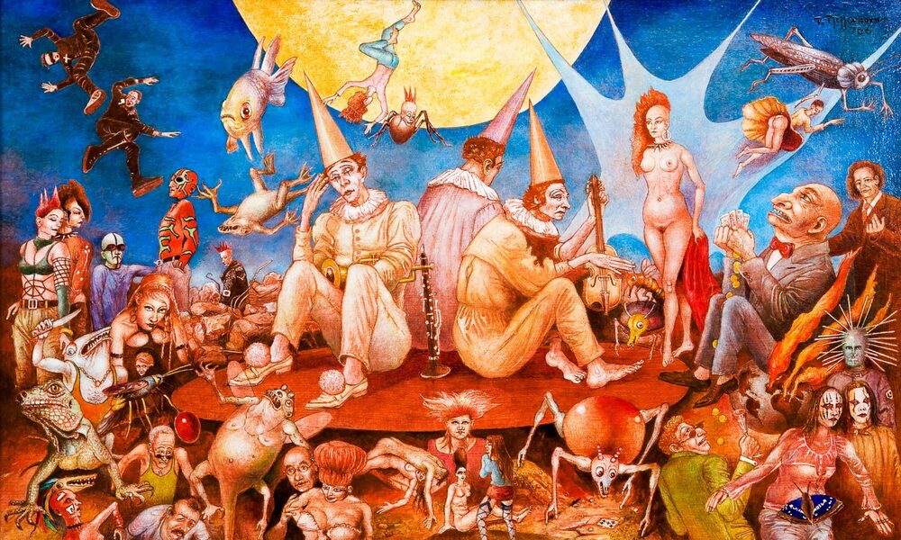 Die Ausstellung "Gesellschaft auf der Bühne" rückt dabei der Vorstellung vom theatrum mundi - dem Weltentheater - entsprechend insbesondere eine Motivgruppe in den Vordergrund, das sich bei Peter Pfefferkorn in vielfachen Deutungen wiederfindet und die fragile Balance zwischen Selbstinszenierung des Menschen und existenzieller Wahrheit in besonderem Maße deutlich macht: Menschen, deren Beruf die Bühne, die Verkleidung ist. Seien es Musiker*innen, Zirkusakteure und Harlekine, Tänzer*innen, aber auch Prostituierte oder Schauspielende – sie alle stehen professionell für Lebendigkeit, bringen Lebensfreude und Alltagsflucht und sind zugleich ein Spiegel. Gerade der Blick hinter die Kulissen dieser Menschen offenbart zugleich einen Blick in das Innerste der Gesellschaft - und so laden die Bilder Peter Pfefferkorns, ob porträthafte Zeichnung oder vielfigurige Malerei, einmal hinter die Fassade zu blicken.