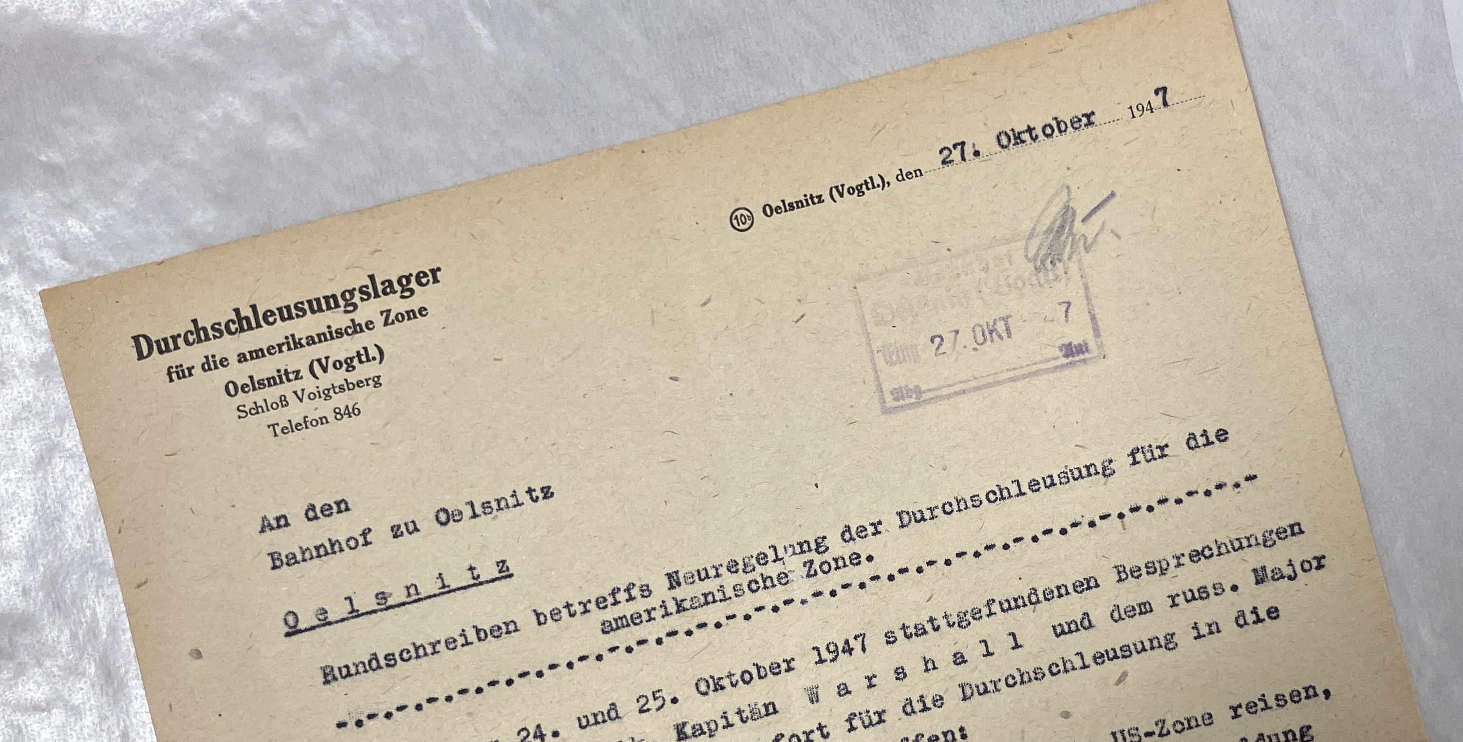 Im Januar 2026 konnte für die Museen Schloß Voigtsberg ein historisch wertvolles Originaldokument vom 27. Oktober 1947 aus dem Durchschleusungslager Oelsnitz erworben werden. Im Dokument wird kurz und klar die Neuregelung der Durchschleusung von der russischen in die amerikanische Zone dargelegt, als Ergebnis einer Besprechung des amerikanischen Kapitäns und russischen Majors – Adressaten sind involvierte Behörden und Dienststellen, hier der Bahnhof in Oelsnitz. Unterzeichnet wurde es vom Lagerleiter Arno Röder. Anhand des Dokumentes ist der bürokratische Akt des Grenzübertritts (für einen bestimmten Zeitraum) im Detail nachvollziehbar. Vorgestellt wird das Dokument in einer Sondervitrine in der noch bis 22. Februar geöffneten Sonderausstellung "Auf der Suche nach Heimat. Das Durchschleusungslager Oelsnitz" von Kuratorin Tina Reitz am Sonntag, 1. Februar, um 11:30 Uhr.